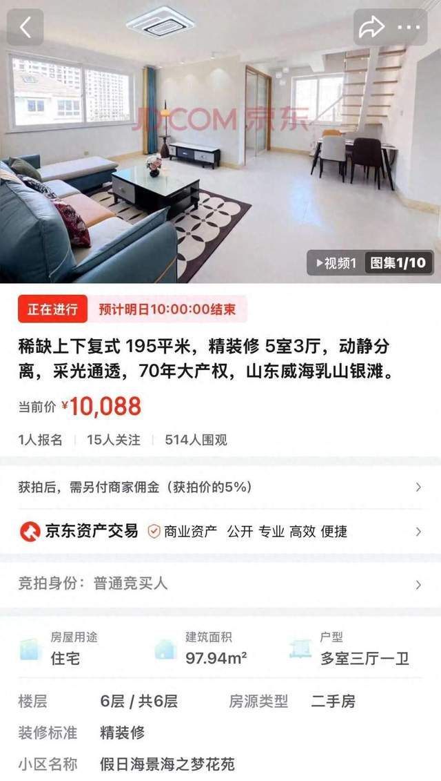 球速体育,球速体育官方网站,球速体育APP下载近日,山东乳山银滩的“195平米复式”在京东资产交易平台上掀起一阵热闹。起拍价只要10 088元,保证金2万元,24 小时内已经被加价到 15 688 元,刷新了不少网友的“三观”。这套房子到底是怎样的“白菜价”,为什麼会被如此低的起点吸引大批买家,又隐藏了哪些坑?下面给大家把这件事拆得更明白一点。