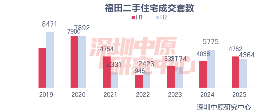 2025年福田二手住宅成交套数为9126套,仅次于龙岗区,位居第二;成交套数同比下滑7.0%,在各区跌幅最大。其中,上半年成交4762套,同比增长17.9%;下半年成交4364套,同比下滑24.4%。福田作为传统核心区,成交基数大,成交量也相对稳定。