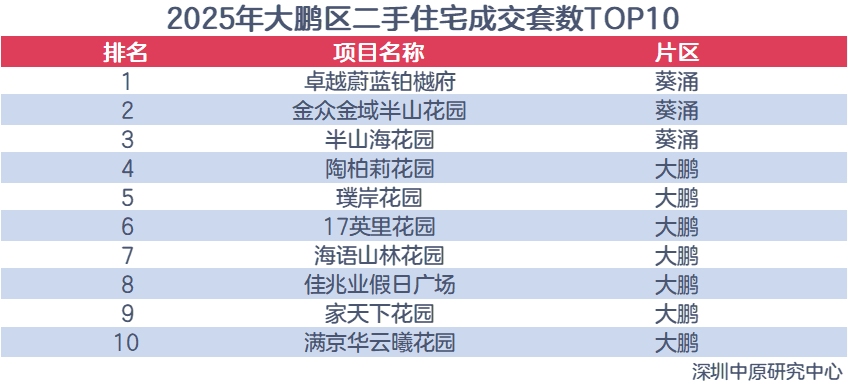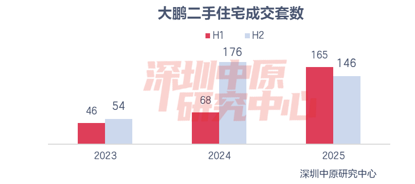 2025年大鹏成交套数为311套,成交量为各区最低;成交套数同比增长27.5%,增幅仅次于光明,位居各区第二。其中,上半年成交165套,同比上升142.6%;下半年成交146套,同比下滑17.0%。
