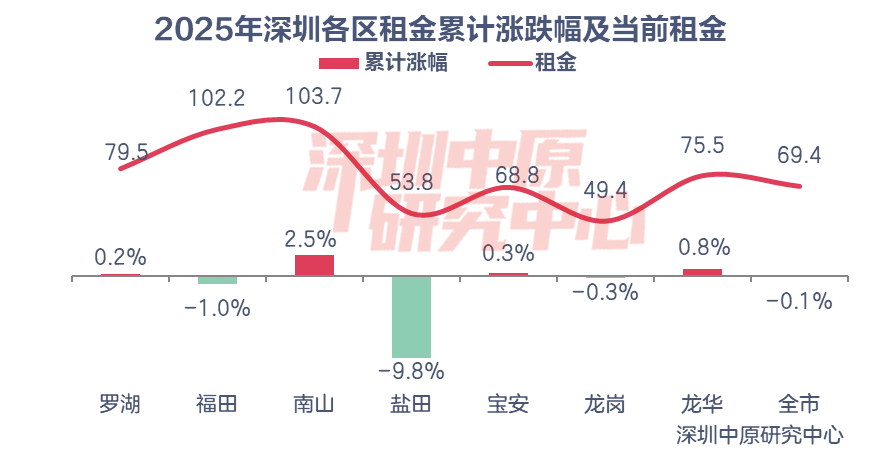 当前深圳租金最高的区域是南山区,租金为103.7元/平·月;租金最低的区域是龙岗区,租金为49.4元/平·月。从累计涨跌幅(1月至12月变化)看,各区租金罗湖、南山、宝安、龙华上涨,其中南山租金累计上升2.5%,涨幅最大;盐田租金累计下滑9.8%,跌幅最大。