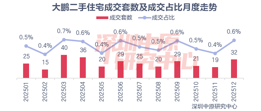 从月度走势图来看,3月大鹏二手住宅成交40套,为全年最高;11月大鹏成交19套,为下半年最低。12月市场略有复苏,成交32套,为下半年最高。从成交占比来看,3月大鹏成交占比0.7%,为全年最高;2月、5月、11月成交占比0.4%,为年内最低。