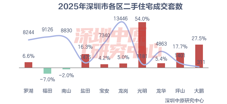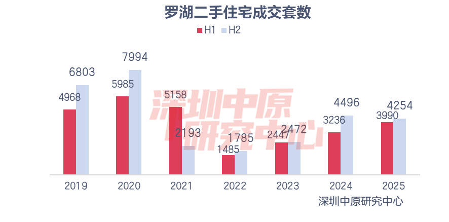 2025年罗湖二手住宅成交套数为8244套,同比增长6.6%,增幅仅次于光明、大鹏、坪山、盐田,位居各区第五,但在核心区域中增幅位居第一。其中,上半年罗湖区成交3990套,同比上升23.3%;下半年成交4254套,同比下滑5.4%。