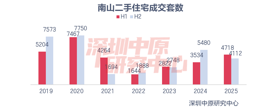 2025年南山区成交套数为8830套,仅次于龙岗、福田,位居各区第三。成交套数同比下滑2.0%,是仅有的两个成交同比下滑的区域。其中,上半年成交4718套,同比增长33.5%;下半年成交4112套,同比下滑25.0%。