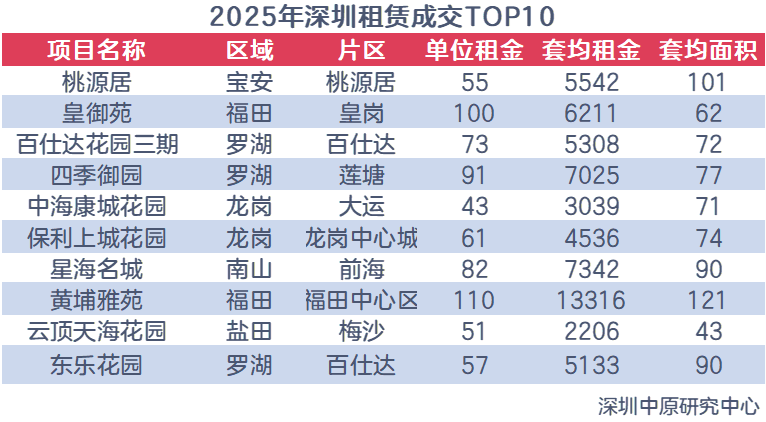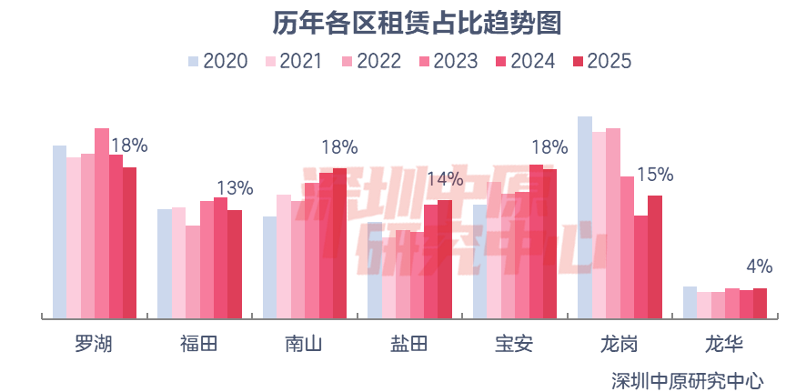 2025年罗湖、南山、宝安租赁占比皆为18%,为全市最高。从占比变化看,罗湖、福田、宝安租赁占比下滑,其他区域租赁占比上升。其中,龙岗租赁占比15%,上升3%,增幅最大。