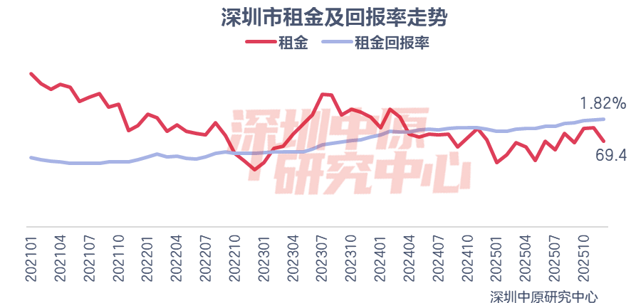 2025年深圳租金整体小幅下降,春节后以及毕业季需求旺盛,租金有所上涨,至年底租金为69.4元/平·月。从租金回报率来看,2025年深圳租金回报率呈现持续回升态势,当前深圳租金回报率为1.82%。