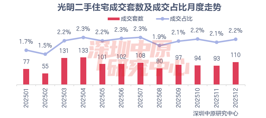 从月度走势图来看,4月光明成交133套,为全年最高。随后成交逐步下行,8月光明二手住宅成交80套,为下半年最低。年底,在市场反弹带动下,12月光明二手成交110套,为下半年最高。从成交占比来看,4月、6月、7月光明成交占比2.3%,为全年最高;2月成交占比1.5%,为年内最低。