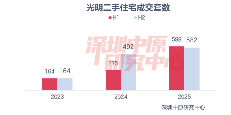 2025年光明成交套数为1181套,成交量仅高于大鹏;成交套数同比增长54.0%,增幅位居各区第一。其中,上半年成交599套,同比上升117.8%;下半年成交582套,同比上升18.3%。一方面,光明区成交基数低,波动也更大;另一方面,近两年光明区大量次新房入市,也激活了二手交易。