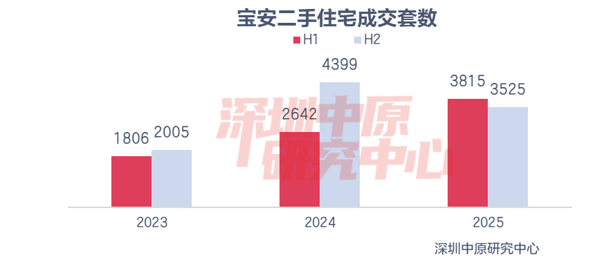 2025年宝安二手住宅成交套数落后于龙岗、福田、南山、罗湖,位居各区第五。宝安区全年成交7340套,同比增长4.2%,增幅仅高于福田、南山。核心区域二手成交基数高,市场相对平稳,增幅也相对较小。2025年上半年宝安成交3815套,同比增长44.4%;下半年成交3525套,同比下滑19.9%。