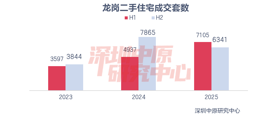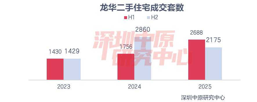 2025年龙华成交套数为4863套,成交量仅高于盐田、坪山、光明、大鹏;成交套数同比增长5.4%,增幅仅高于福田、南山、宝安、龙岗。其中,上半年成交2688套,同比上升53.1%;下半年成交2175套,同比下滑24.0%。